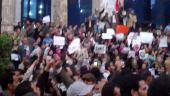 protesters holding Al Tahrir News paper, with the picture of the blue bra girl in the front page. The headline says Kazeboon "Liars"